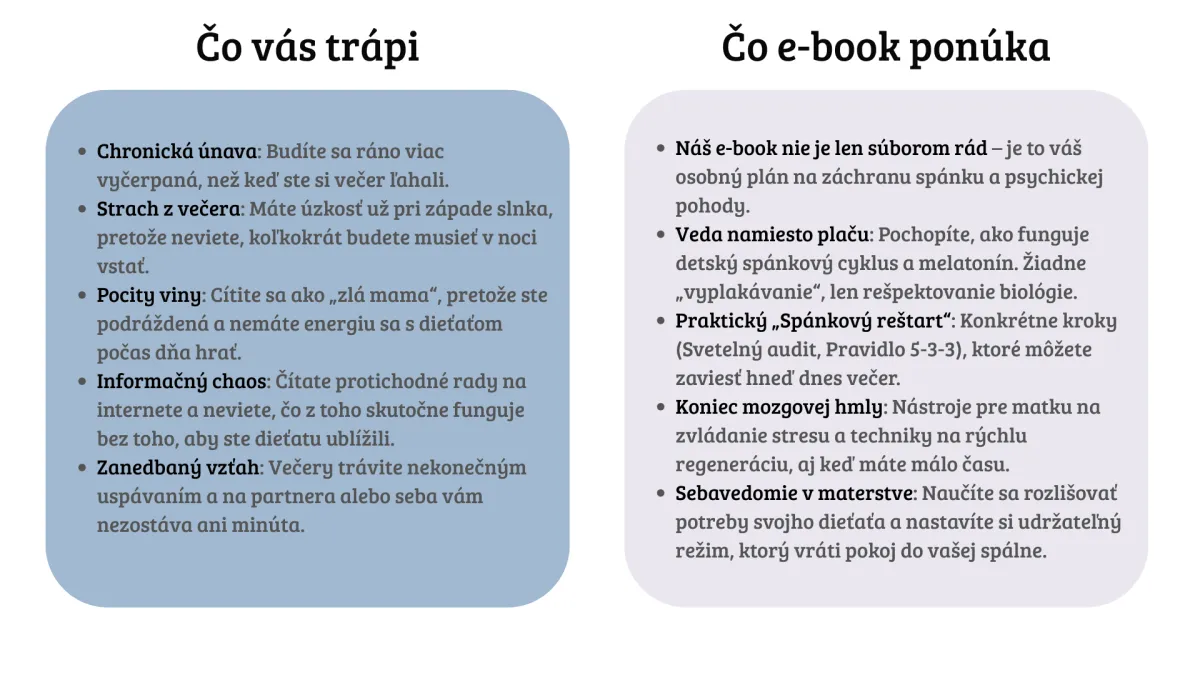 „Dlho som odmietala akékoľvek 'tréningy' spánku, lebo som nechcela nechať malého plakať. Tento e-book mi otvoril oči. Stačilo zmeniť pár vecí v našej večernej rutine a upraviť svetlo v izbe. Po týždni malý prespí 5-hodinový blok a ja sa po roku konečne cítim ako človek. Ďakujem za ten empatický prístup k nám mamám!“ – Lucia, mama 10-mesačného Samka